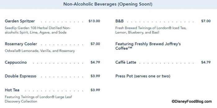 If you aren’t in the mood for an alcoholic beverage during your visit to the Enchanted Rose Lounge, you’ll still have several non-alcoholic drinks to choose from!