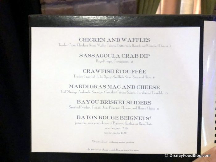 Alright, enough of the bar menu! It’s time to get down to what we came here for! The food! It looks like the Scat Cat Lounge’s offerings have mostly stayed the same. Their eats include a sweet and spicy Chicken and Waffles, Sassagoula Crab Dip, Crawfish Etoufee, Mardi Gras Mac and Cheese, Bayou Brisket Sliders and Baton Rouge Beignets- which you can read out review of here!
