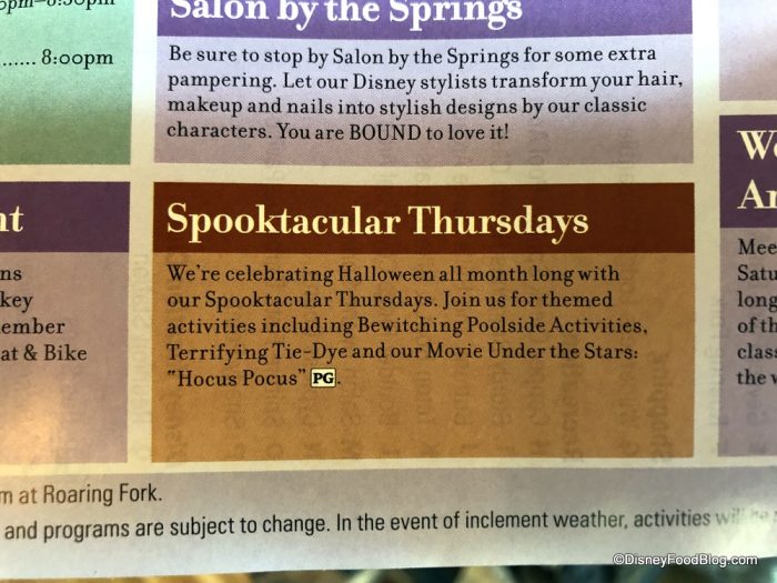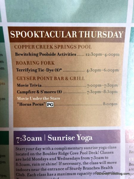 Finally, we want to note that the October activities guide for Wilderness Lodge is featuring “Spooktacular Thursdays” each week for the month.