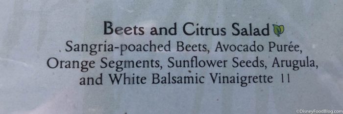 The Beet and Citrus Salad features Sangria-poached beets, avocado puree, orange segments, sunflower seeds, arugula, and white balsamic vinaigrette.