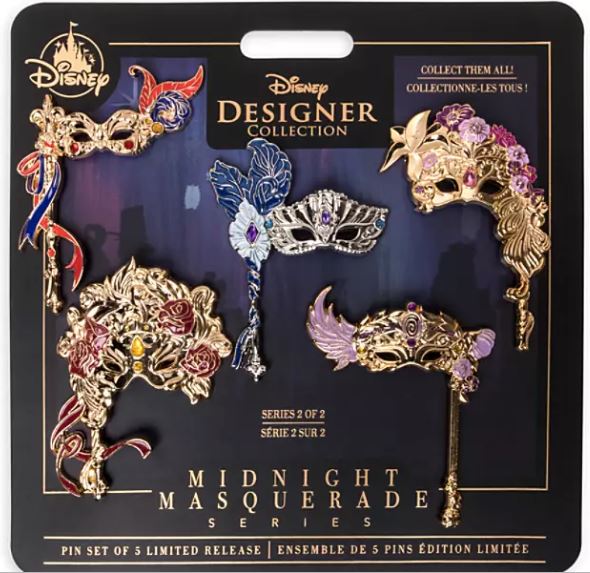 The Midnight Masquerade Designer Collection also has two sets of Limited Edition pins — the first has 5 gals in their fabulous gown dresses. ($39.95)