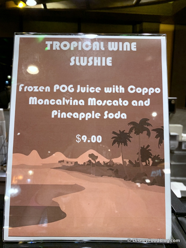 We saw a menu advertising the Frozen POG Wine Slushie for $9 at Kona Island in Disney’s Polynesian Resort. The drink was listed as Tropical Wine Slushie, but a closer inspection of the fine print revealed the main ingredient of this cold masterpiece was none other than, you guessed it, POG Juice!