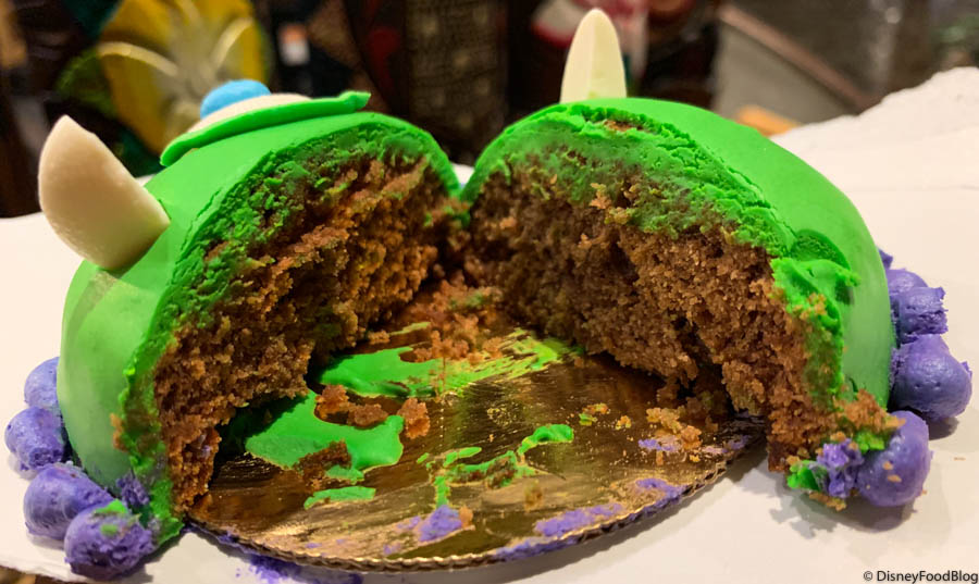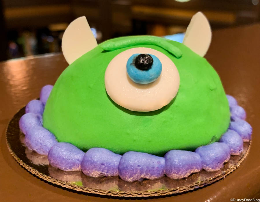 The Mike Wazowski dome cake is a chocolate cake with chocolate chips and a green chocolate ganache. This cake reminded us of the Stitch cake that appeared at Kona Island a few months ago, but we enjoyed this option a bit more.
