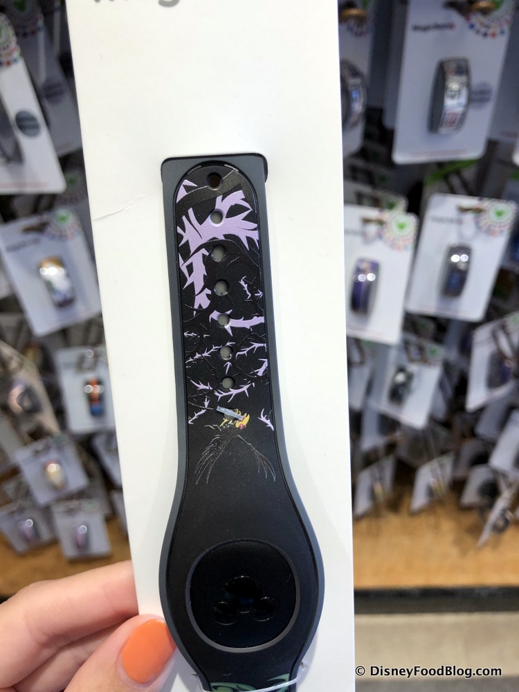The new MagicBand has the updated packaging that Disney’s been releasing their newer MagicBands with. One side of the band features a very pensive Maleficent while the other has her raven sidekick and lots of spikey thorns!