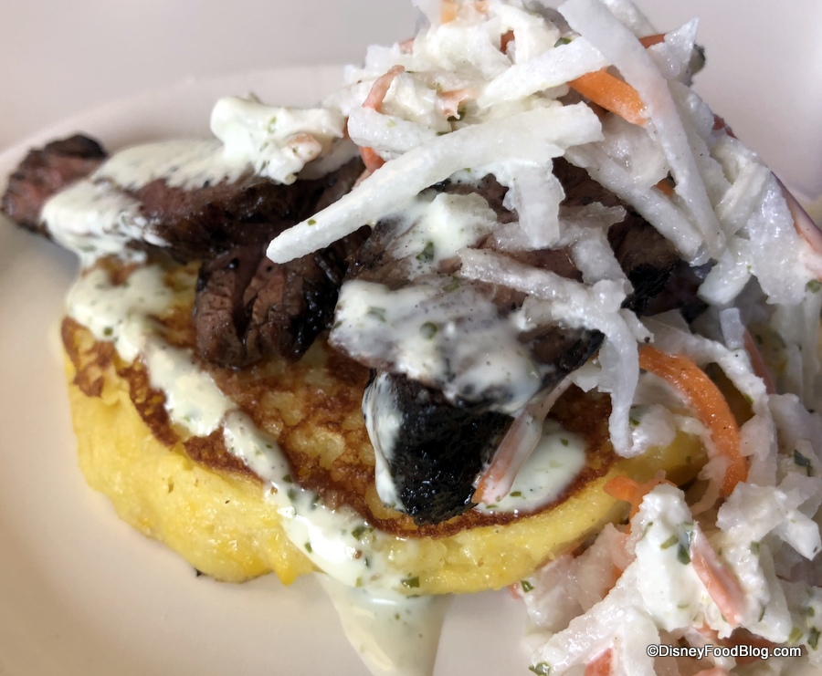 Charred Chimichurri Skirt Steak on a Smoked Corn Cake with Pickled Vegetable Slaw and Cilantro Aïoli — $7.00, DDP Snack Eligible