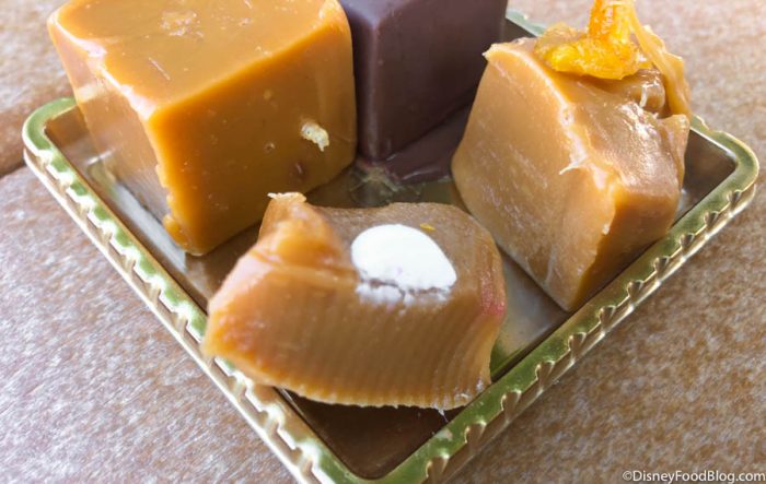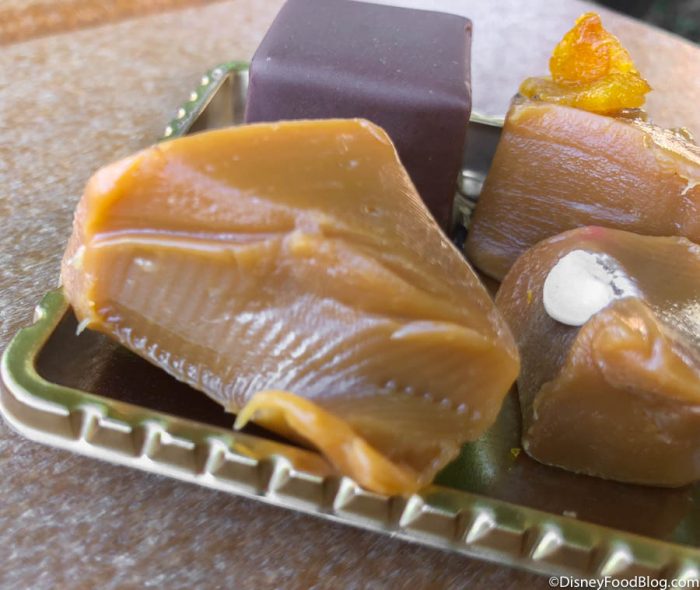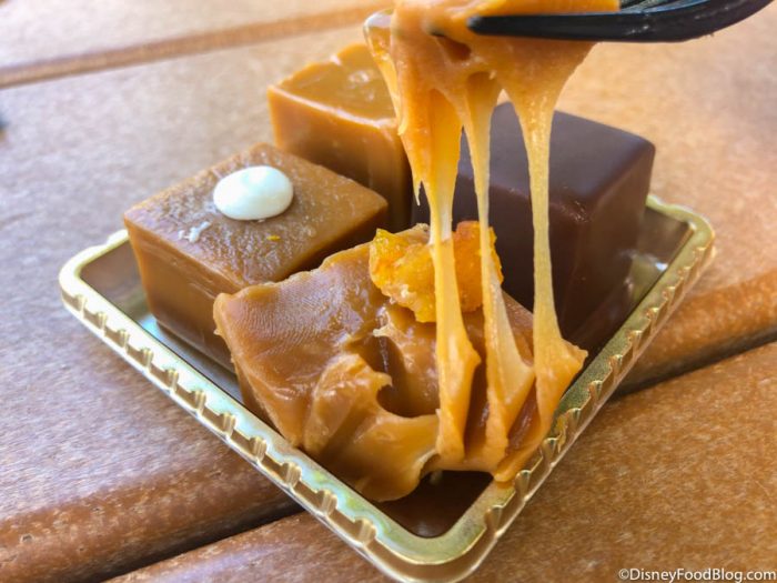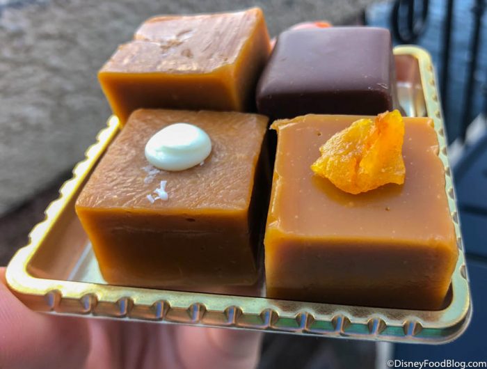 There wasn’t a sign out yet for these treats, but when we asked a Cast Member what they were, they informed us they were alcohol-infused caramel squares! Whaaaaaat?!? The Cast Members weren’t quite sure what flavors each of these little caramel squares were but rang one set of 4 up for us…for only $6.49!