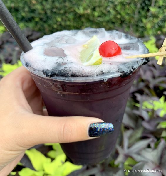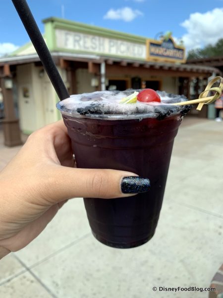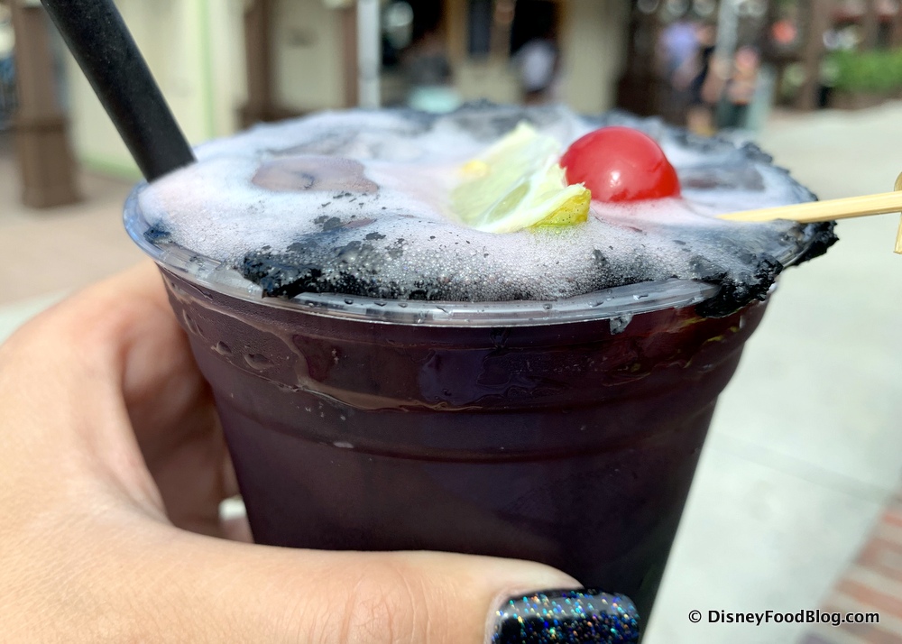 We found Cast Members pouring this dark purple potion over at Dockside Margaritas in Disney Springs! The concoction features Patron, Grand Mariner, sweet and sour mix, and black cherry syrup with a sinister-looking black rock salt rim!