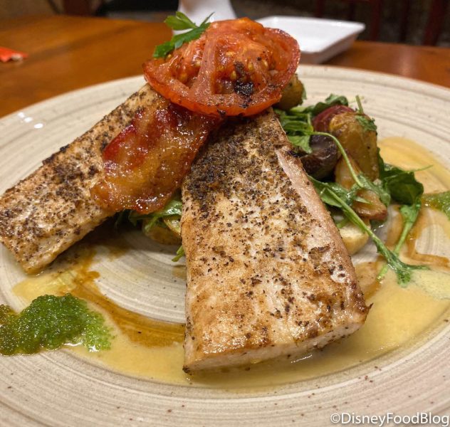The pan-fried mahi-mahi comes with oven-dried tomato, arugula, bacon, butter croutons, new potato, soy velouté, and wasabi caviar.