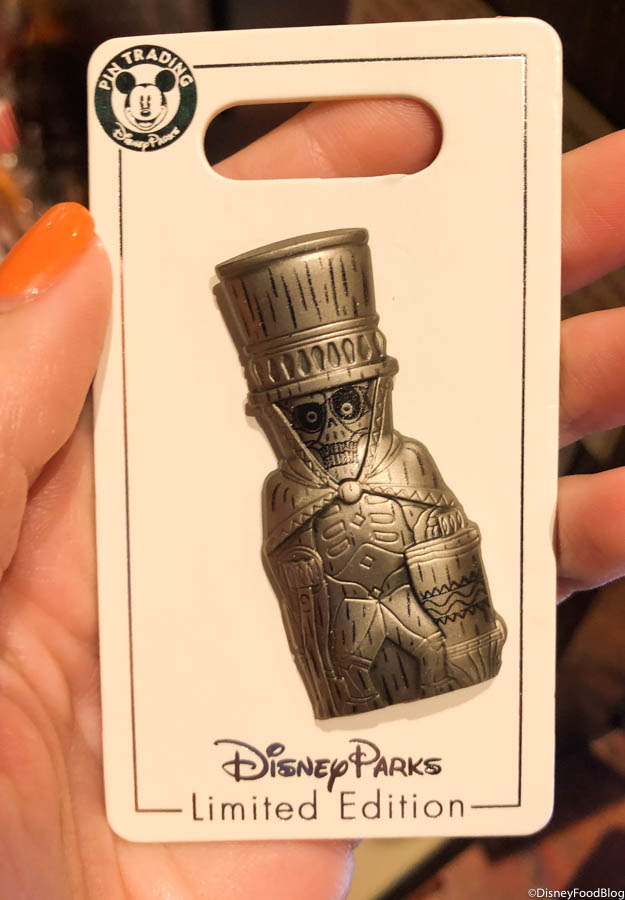 The Limited Edition Hatbox Ghost Pin ($17.99) in Disney World also shows off the Hatbox Ghosts face! This silver pin features an extravagant amount of detailing on our pal, Hatbox Ghost!