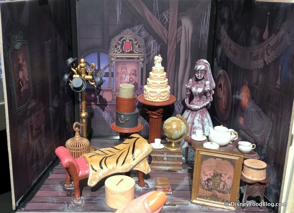 From its miniature chaise lounge to its empty birdcage, globe, trunk, pedestal and wedding cake, we feel like we’re on a teeny-tiny Haunted Mansion! And there’s so many hats and hatboxes, but sadly no Hatbox Ghost in sight! (But if you’re looking for him, check out the Hatbox Ghost Tiki Mug for sale at Disney’s Polynesian Village Resort here!)
