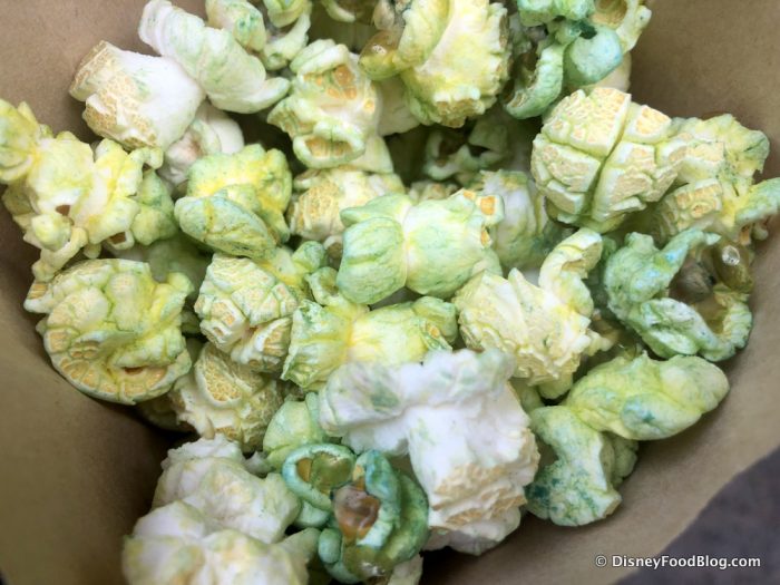 The Galaxy Green Popcorn tastes more like the traditional buttery popcorn you’ll find throughout the Disney parks — its green coloring is flavorless and gives the popcorn its signature hue!