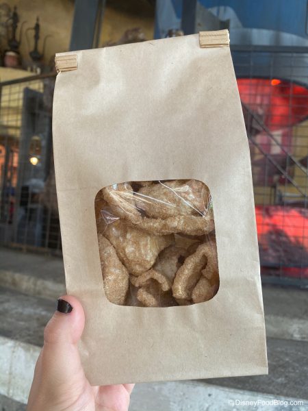 But fear not, carnivores! Disney hasn’t forgotten our pork-loving friends and just launched today a very NOT VEGAN ITEM — Cinnamon Sugar Kyryll Pork Rinds. The force was strong with our high hopes for this new item. (HELLO! Ronto Roasters is THE spot to go in Star Wars: Galaxy’s Edge for their DELICIOUS and seriously addictive Ronto Wrap. This place knows their way around some meat!).