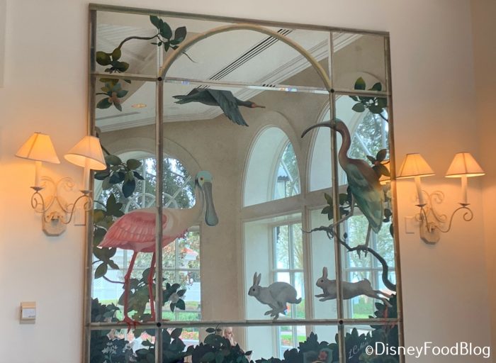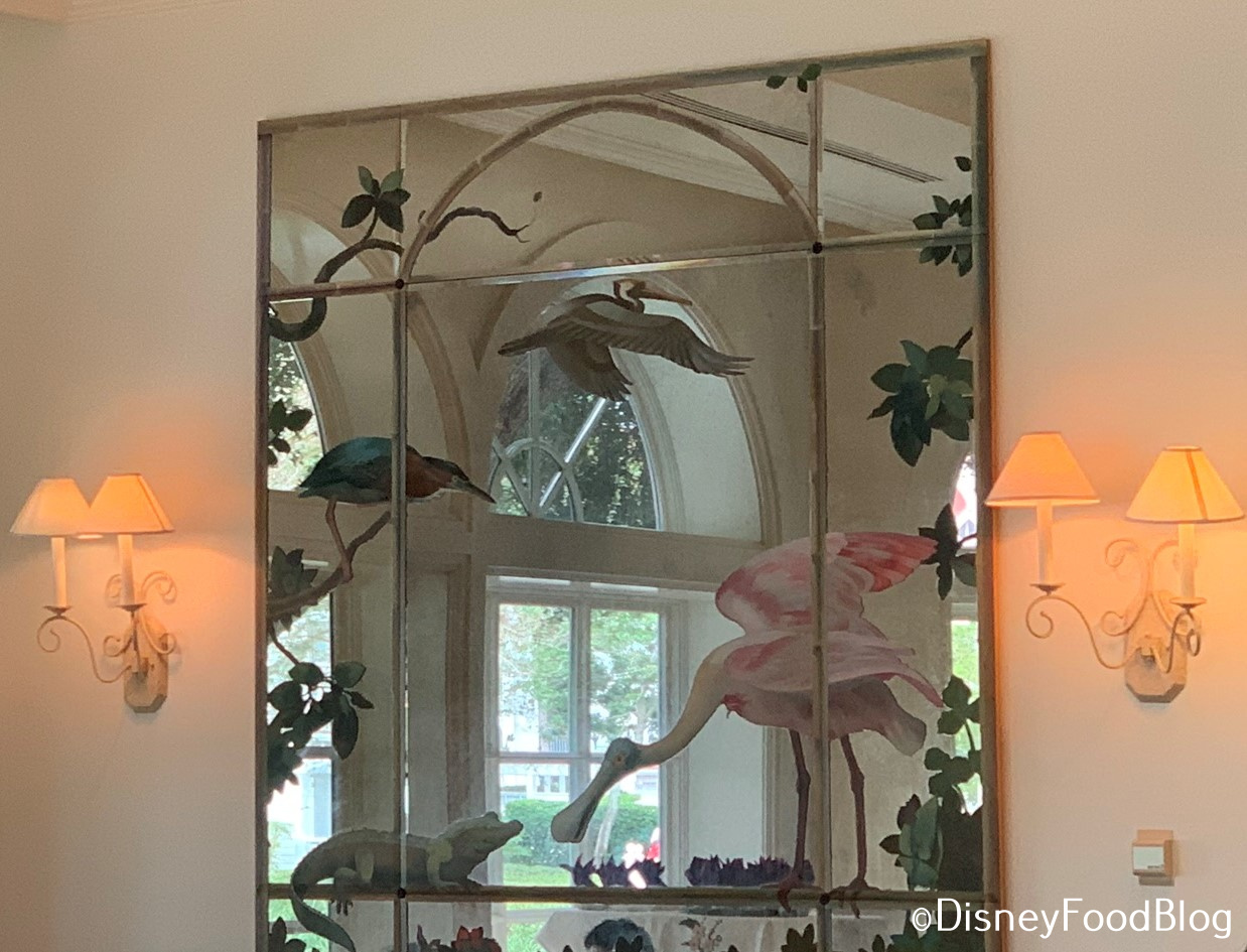 There are large mirrors on either side of the room, both seemingly handpainted with Floridian nature scenes.
