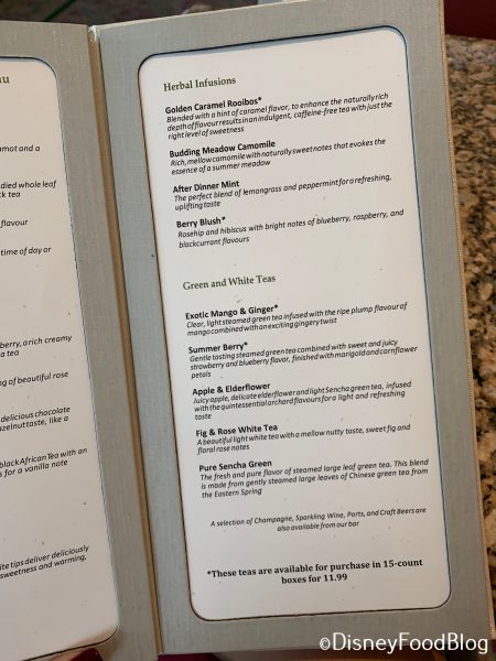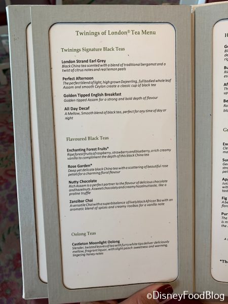 You also need to select which tea you’d like — and there are a lot more than three options! All of the teas are Twinings of London, and the lengthy menu is divided by tea varietals.