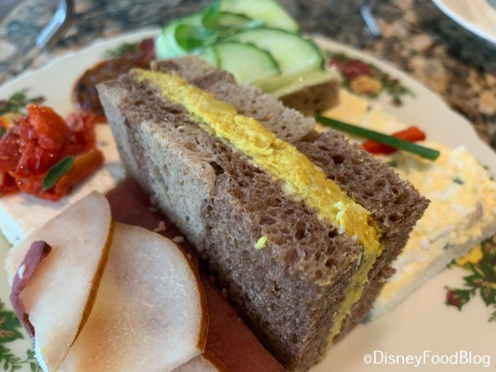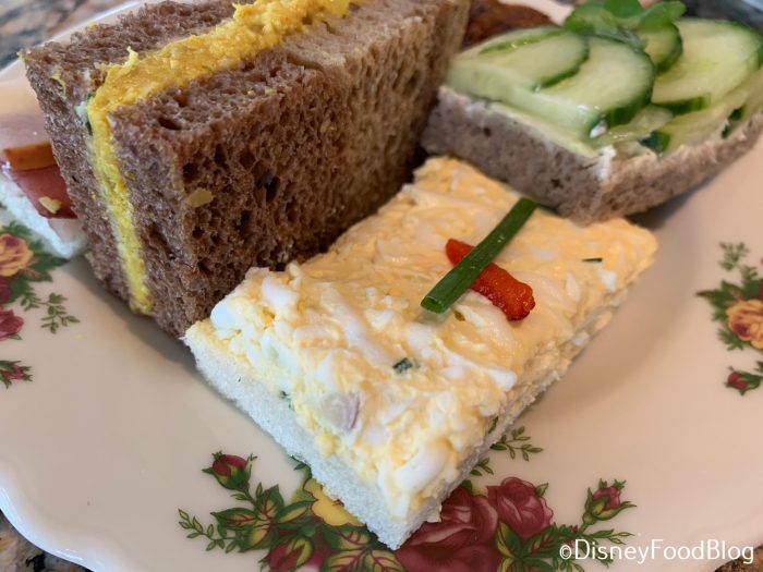 How cute is this tiered plate display?! Let’s take a closer look layer by layer — first up, sandwiches! Each adult receives a platter of 6 tea sandwiches…or half sandwiches, ’cause some of ’em didn’t have top bread pieces.