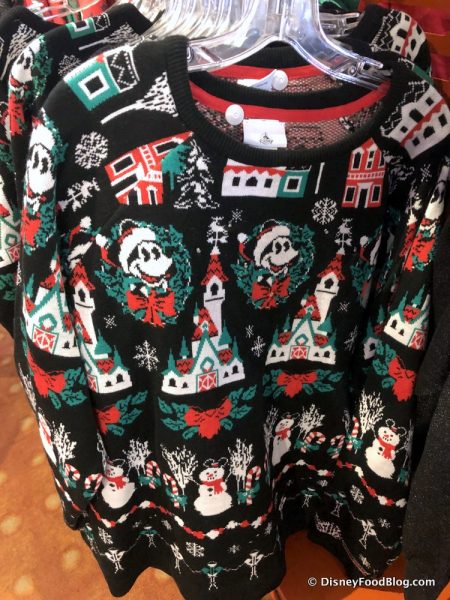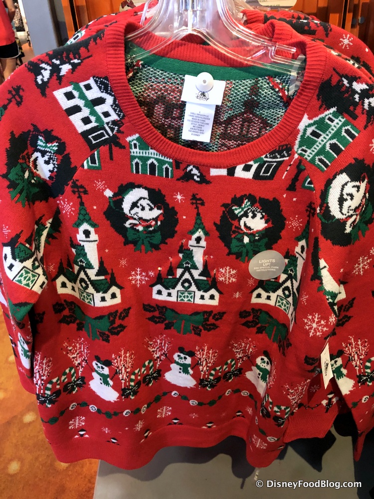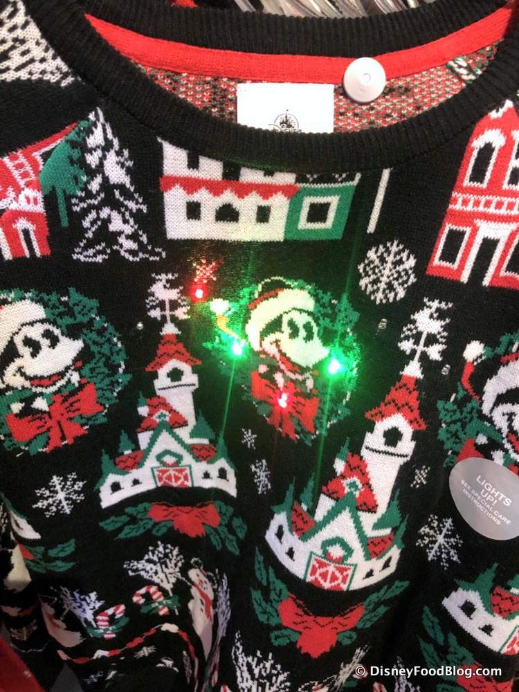 We also spotted this super-cute Ugly Mickey Sweater for $64.99. It’s covered in a repeating pattern of Mickeys, castles, snowmen, candy canes, and buildings all gussied up for Christmas! It’s just brimming with festive cheer — and even has a little secret Christmas magic!