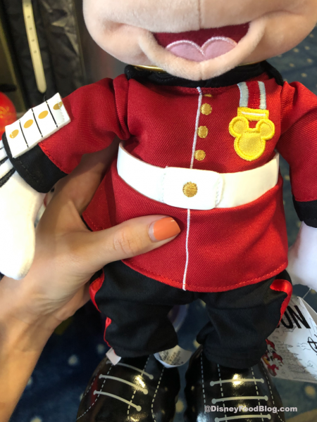 Sporting the traditional uniform of a red tunic and bearskin hats, London Mickey dutifully protects his royal family. Notice the gold Mickey emblem proudly depicted on his jacket.