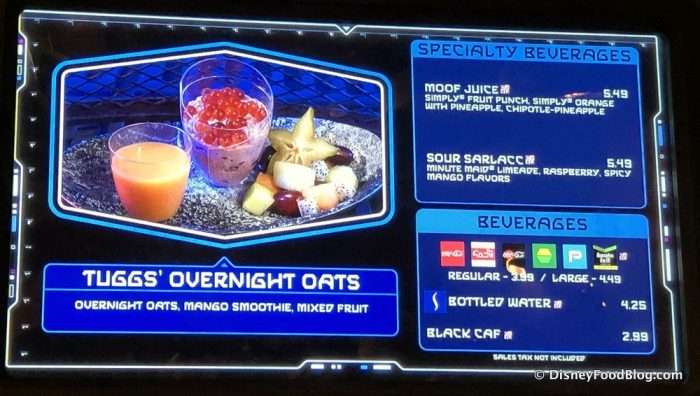 The new Tuggs’ Overnight Oats cost $10.99 at Docking Bay 7 and may be worth the premium cost for its presentation, but its kinda a lot of money for not a lot of food, in our opinion. For the money and convenience, you may prefer grabbing your oats in a to-go cup from Ronto Roasters or Oga’s Cantina instead!