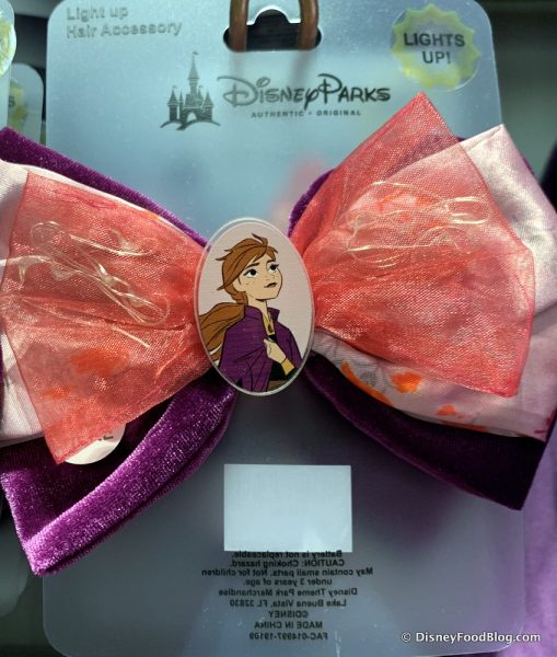 And our last piece of Frozen 2 merch is the adorable Anna Bow for $14.99! Just like the Elsa Bow, it also lights up, but instead of sequins, the beautiful bow has purple velvet accents!