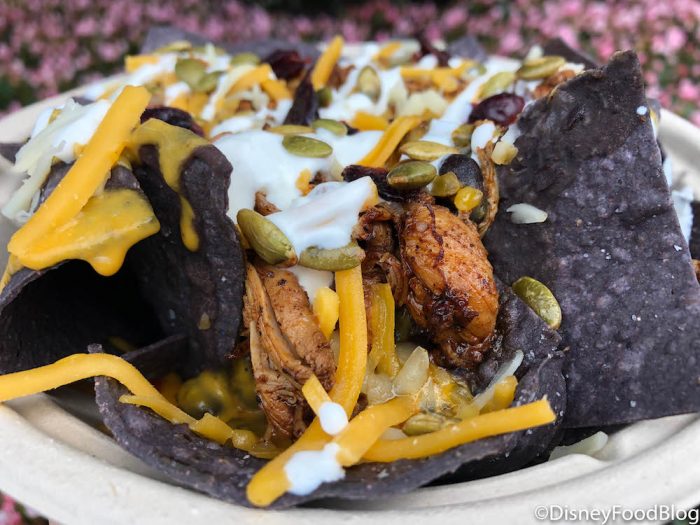 The blue corn tortilla chips are topped with chicken adobo, pumpkin cheese sauce (?!), lime crema, dried cranberries, and toasted pumpkin seeds.