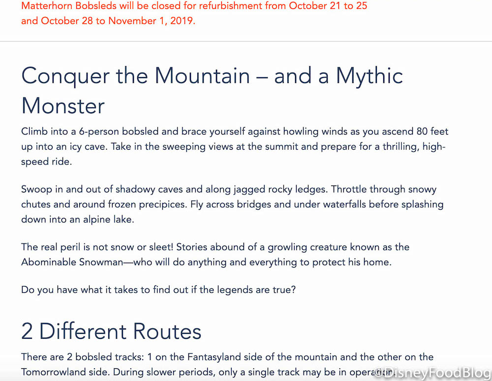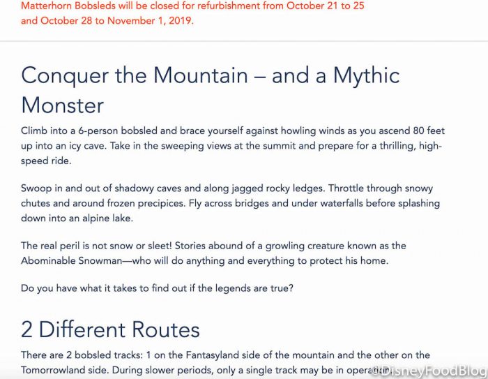 Although we love hopping on the bobsleds inspired by Switzerland‘s actual Matterhorn, the epic escape from the Abominable Snowman will be taking a hiatus over the next week.