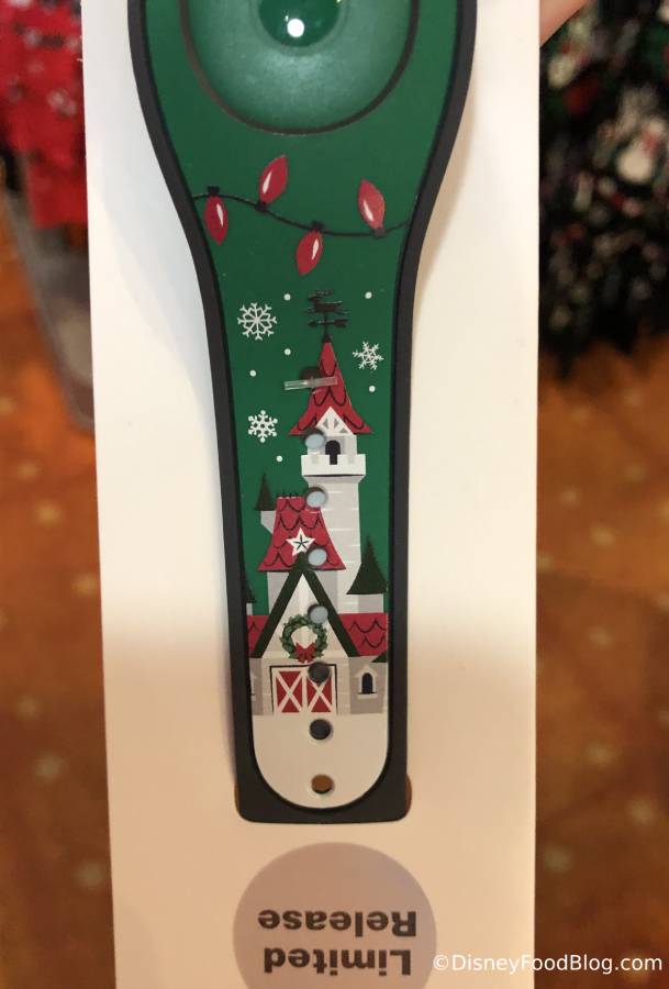 The opposite side of the MagicBand has a version of Cinderella Castle stylized as a Christmas castle, complete with a little wreath.
