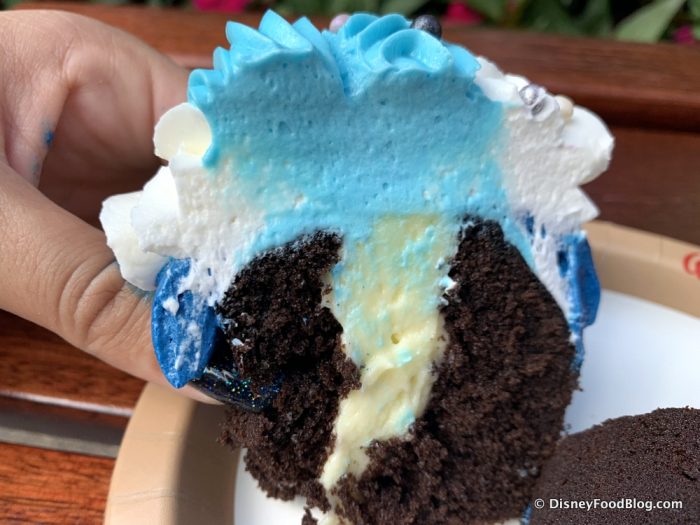 But we digress! Time to get down to business! The business of EATING, that is! When we finally got to chow down on the Water Spirit Cupcake, we found the chocolate cake to be very rich and moist while the white chocolate filling was really good, too!
