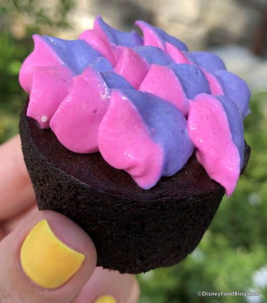 Next, we tried a mini chocolate “Fire” cupcake with pink and purple buttercream piped in a fun fire pattern. The colors are super cute here and the cake was very moist and chocolatey!