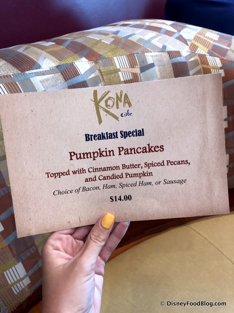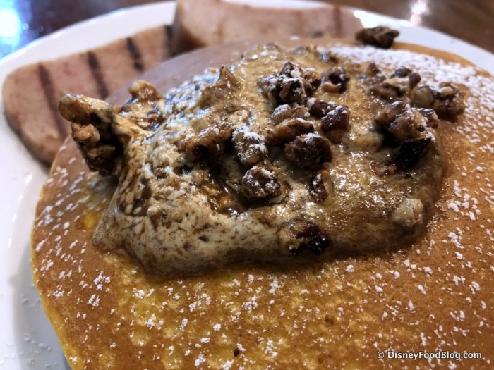The Pumpkin Pancakes cost $14 and come with your choice of bacon, spiced ham, or sausage. We asked a Cast Member how long they’d be hanging around for, and after verifying with the chef, it seems likely they’ll be at Kona Cafe until at least Thanksgiving — and maybe a little white after! But remember, anything can change at Disney sooo ya never really know!