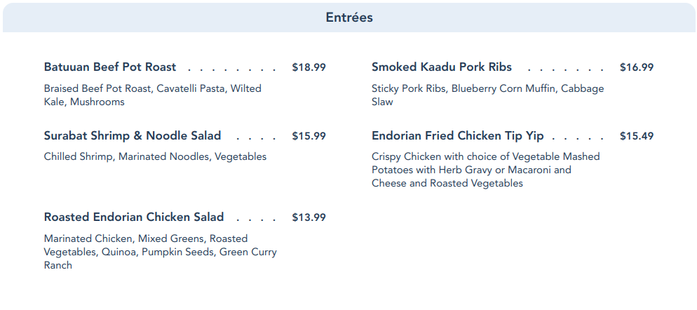 Well now, it looks like Docking Bay 7 has reached a compromise between easy, understandable names and fun Star Wars flavor. We’ve seen an update to the menu today that features a sort of hybrid new naming. Now, you can order Endorian Fried Chicken Tip-Yip or Batuuan Beef Pork Roast.