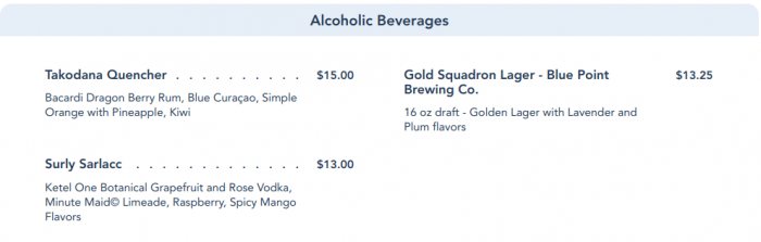 AND it looks like they’ve tucked in a new alcoholic beverage called the Surly Sarlacc. This should look relatively familiar to those who’ve tried the Sour Sarlacc over at Ronto Roasters. It’s the same base for the drink — limeade with raspberry and spicy mango flavors — but with the addition of Ketel One Botanical Grapefruit and Rose Vodka. Yum! This option is $13, making it $2 cheaper than the Takodana Quencher.
