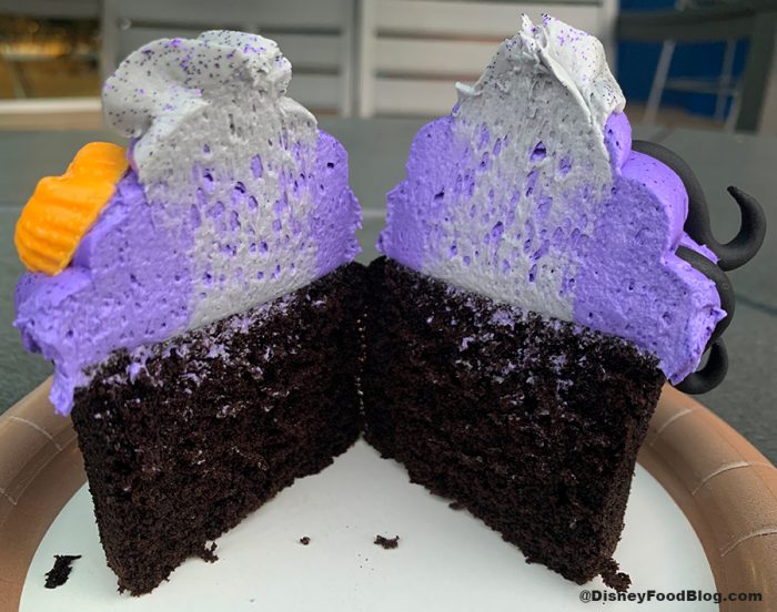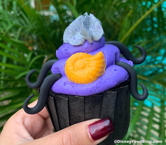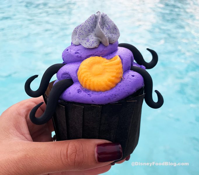 The sweet focus of most Disney bakery cases right now may be Frozen 2, but we’re HERE for our baddies getting some love too! Earlier this year, we found a delicious Ursula cake at the Contempo Cafe for Villaintine’s Day so we were WAY excited to try this new cupcake we spotted at All-Star Music Resort! Did it match up?