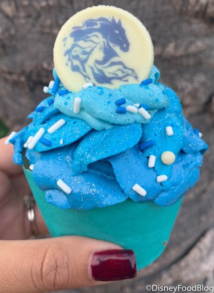 The funfetti cupcake has blue sprinkles throughout the cake and blue buttercream with sprinkles and edible glitter on top. A white chocolate disc featuring Elsa and the Nokk finishes the design.