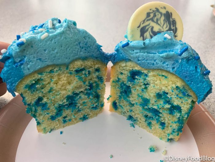 While we looove funfetti cake, the only other real component of the Frozen Fractals Cupcake was the blue buttercream. The white chocolate disc and sprinkles added a crunch to all that frosting, but there was no filling in the center. Even though it was tasty and pretty, we felt like it was lacking in comparison to the other Frozen 2 treats, like the Hidden Truth Cupcake.