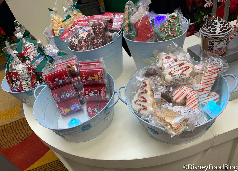 There’s pre-packaged Crisped Rice Cereal Treats, hot cocoa, and pretzels…
