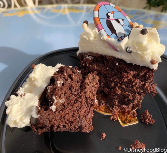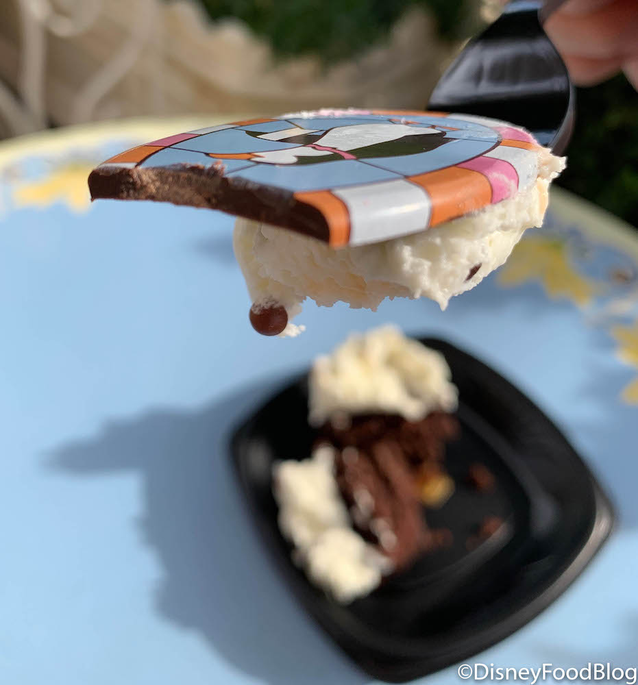 The chocolate brownie has chocolate chips mixed into the batter (YUM) and vanilla buttercream, crispy pearls, and a milk chocolate Mary Poppins Penguin disc (which just so happens to match the lovely stained glass windows at Jolly Holiday) top the treat.