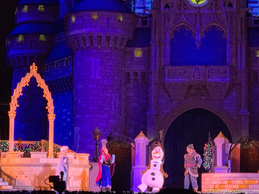 For the holidays, Elsa and Anna join Kristoff and Olaf for “A Frozen Holiday Wish” nightly throughout the season in front of Cinderella Castle.
