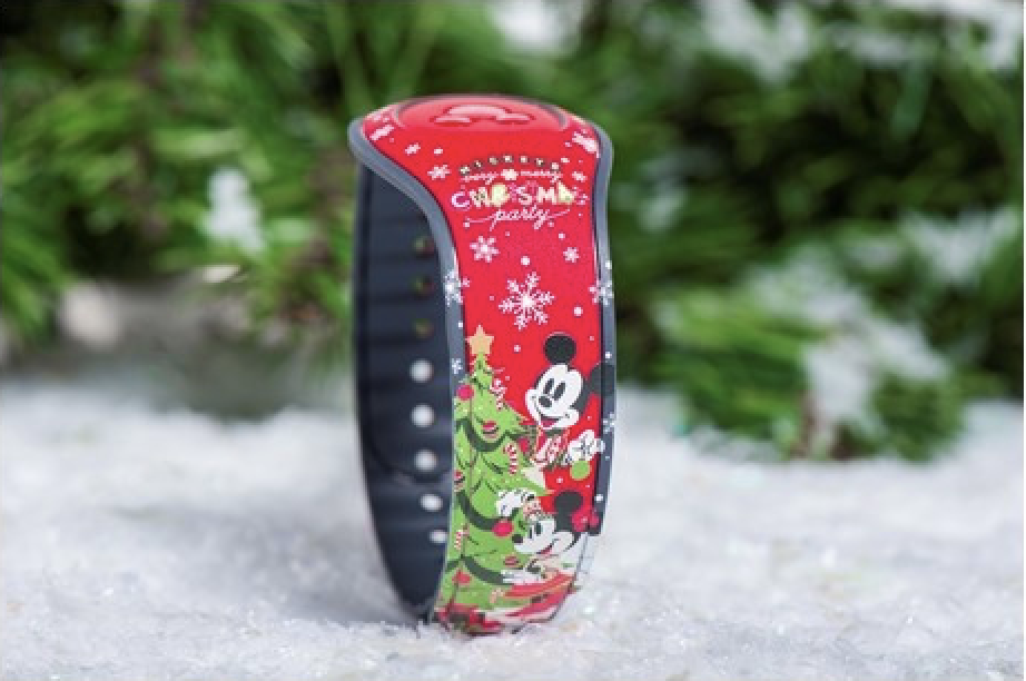 The Mickey’s Very Merry Christmas Party MagicBand comes in a festive red and features Mickey and Minnie coming together to make their season bright by decorating their Christmas tree!