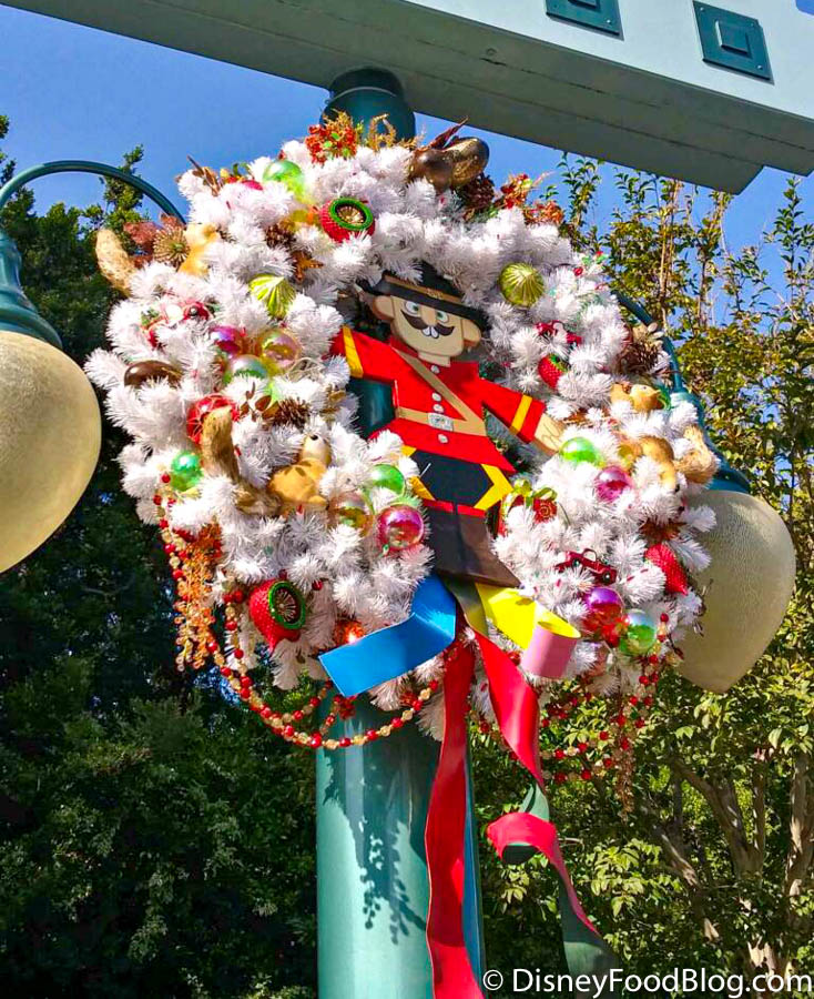 We don’t even have words, except for “Where can we get one of these holiday wreaths for ourselves?”! The white tinsel is filled with neon baubles and decorations that are so unique! This one was hanging near it’s a small world (recognize the Canadian Mountie?!).