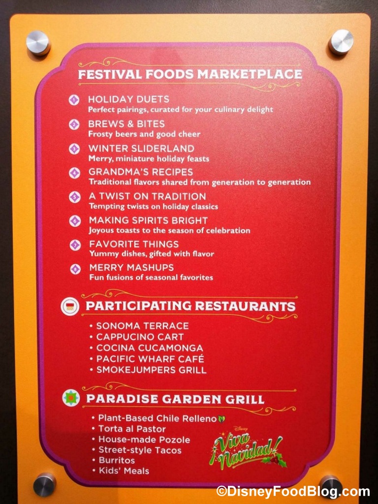The Marketplace Booths feature seasonal eats and treats from around the world in the Festival Corridor. We spotted the sign below placed out in preparation for the Festival of Holidays. Last year’s Festival included 12 booths. We’ve spotted 8 booths out already and it’s looking like that may be the final number this year if the sign below is any indication!