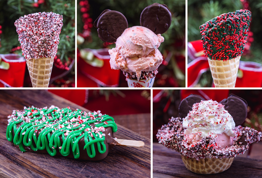 Around the park at other carts, look for fun holiday flavors of cotton candy like Hot Chocolate, Snowflake, and a Peppermint flavored Tree Shaped cotton candy!