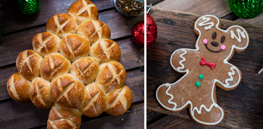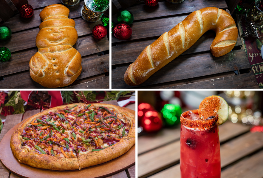 Pacific Wharf Café is baking up their popular Candy Cane, Snowman, and Pull-apart Christmas Tree-shaped Sourdough Bread as well as a Mickey Gingerbread Man Cookie and Sugar Cookie with red and green sprinkles.