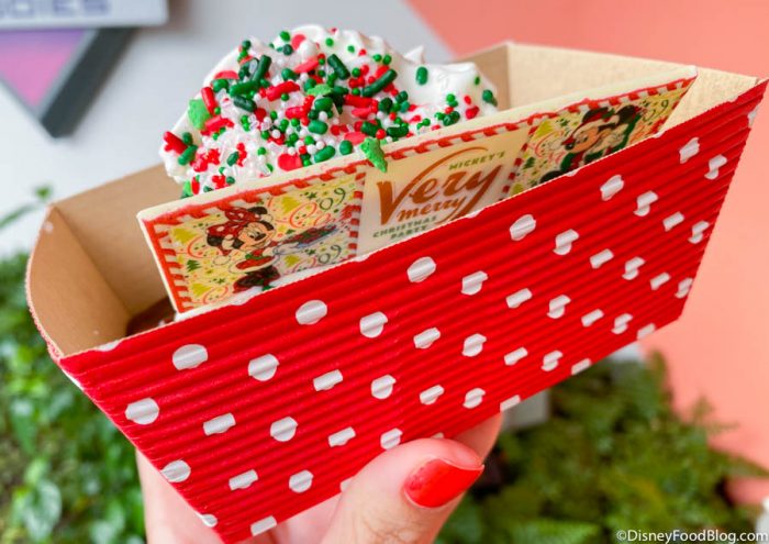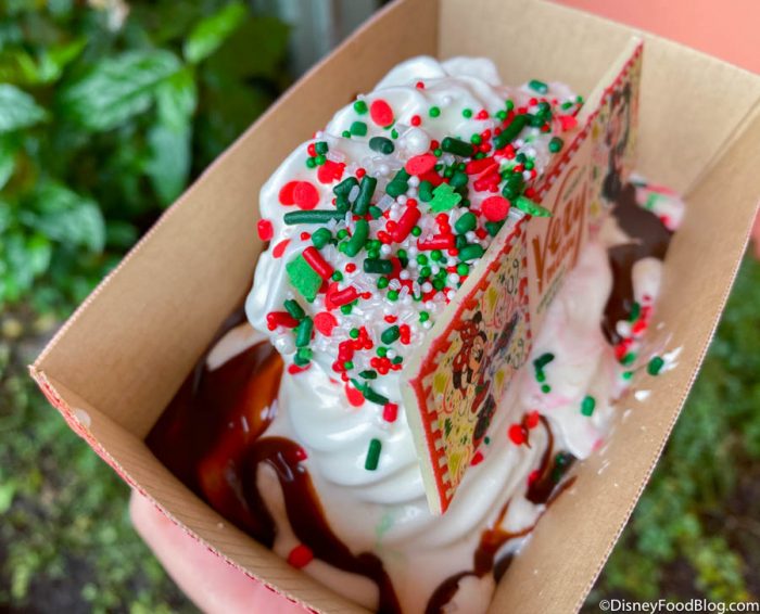 The same cookie butter soft serve used in the milkshake is the star here. This time, it’s served with a drizzle of chocolate sauce, whipped cream, holiday sprinkles, and a cute white chocolate piece!