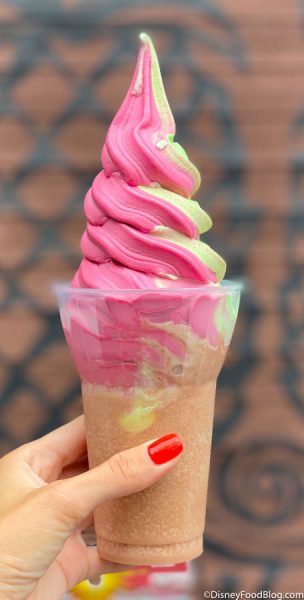 This one consists of cherry and pistachio swirled soft-serve atop frozen hot chocolate, and it’s totally Insta-worthy for its bold soft-serve color combo. The cherry soft serve in particular is super saturated.