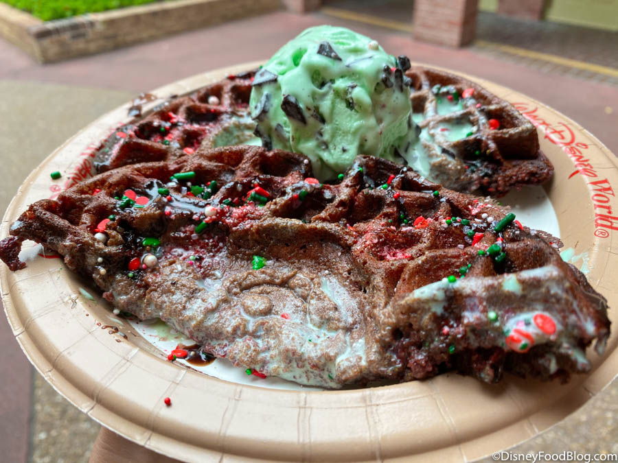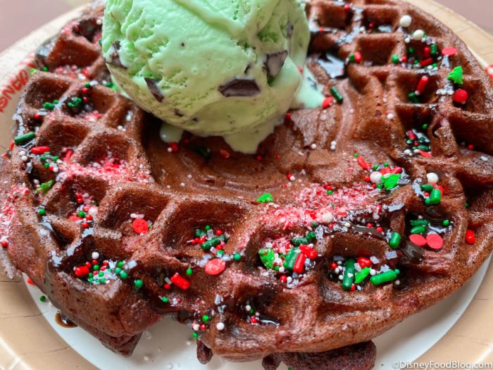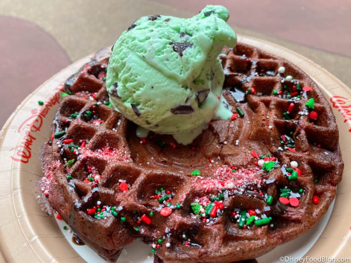 The Santa Mickey Waffle Sundae is made with a red velvet waffle, topped with mint-chip ice cream, seasonal sprinkles, chocolate sauce, and peppermint powder. This isn’t the first time we’ve seen Mickey Waffles featured in a sundae. This fall, we had the Pumpkin Mickey Waffle Sundae, and Sleepy Hollow has also offered the Mickey and Minnie Waffle Sundae.
