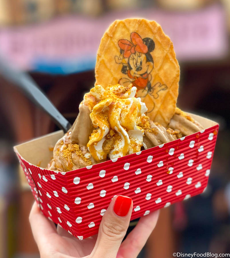 This year’s seasonal goodie du jour at Storybook Treats is a Gingerbread Sundae. Priced at $6.49, it features gingerbread soft serve topped with a sprinkle of gingerbread pieces, whipped cream, and a Minnie Mouse waffle topper.