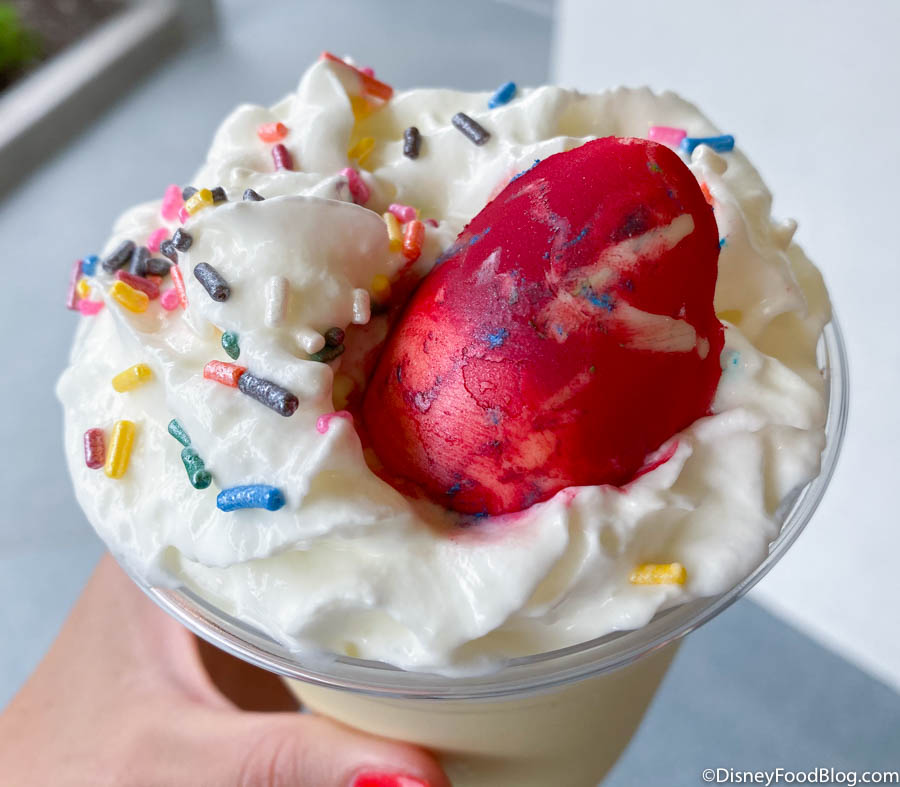 This frosty treat is frozen eggnog topped with whipped cream, sprinkles, and a “chocolate Christmas bulb.” We’ll get to that red situation in a moment, but first let’s focus on the ‘nog.