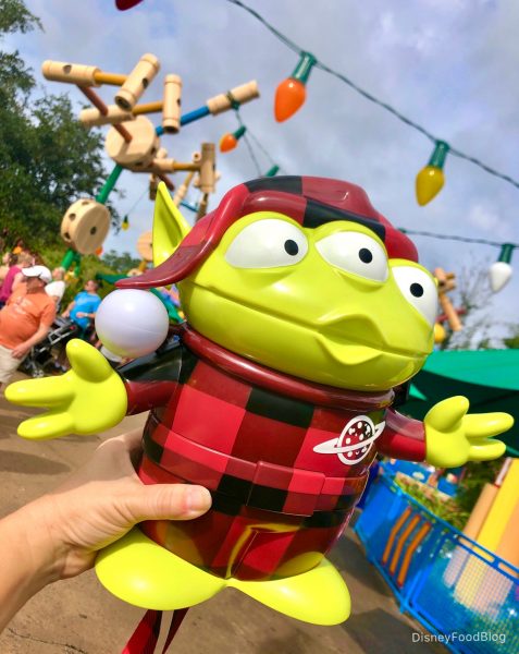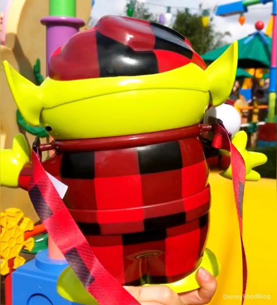 He’s a variation on last year’s Santa Alien Popcorn Bucket, so of course you MUST have him if you have that one! His little carrying strap is also Buffalo plaid, and he’s got that Pizza Planet logo on his outfit…lest he forget his origins.