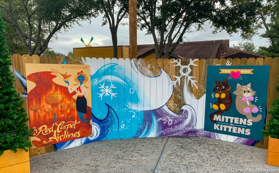 …are the themed posters inspired by the Disney movies that the trees are based on! Check out the Red Carpet Airlines from Aladdin, the Mittens for Kittens from Frozen…