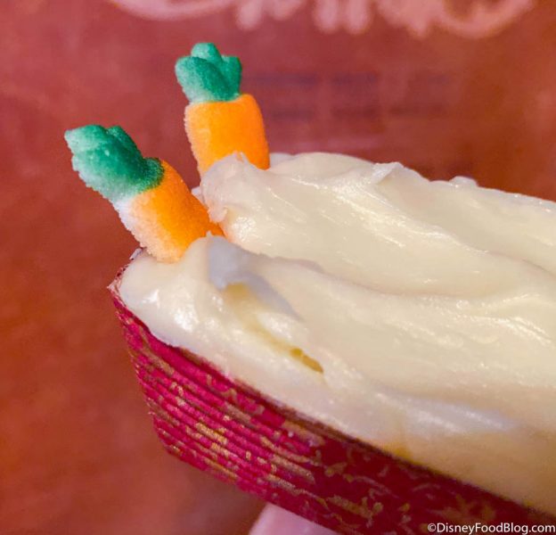 The Mickey’s Very Merry Christmas Party- exclusive dessert is carrot cake topped with cream cheese frosting, sugar carrots, and a white chocolate piece featuring our pal with the big antlers (and appetite for orange root vegetables), Sven!